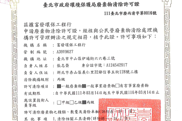富發環保擁有15餘年的專業豐富經驗,秉持著初衷為客戶解決廢棄物困擾的問題,有最專業的團隊,以最積極負責的態度,來處理客戶的每一項需求,都能為您協助清運回收廢油(水)。